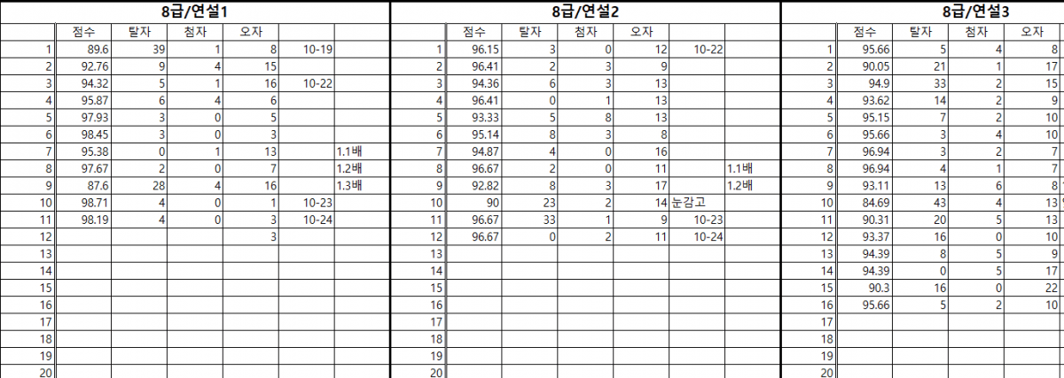 이렇게 10급~4급까지 정확도와 오첨탈자수, 배속 등을 기록하고 얼마나 실력이 올랐는지 항상 체크했습니다
