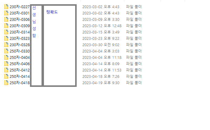 자수반에 와서도 수업마다 파일을 만들어서 분류해 넣어주고 날짜와 선생님 성함, 그날 점수 등을 제목으로 해두었어요.