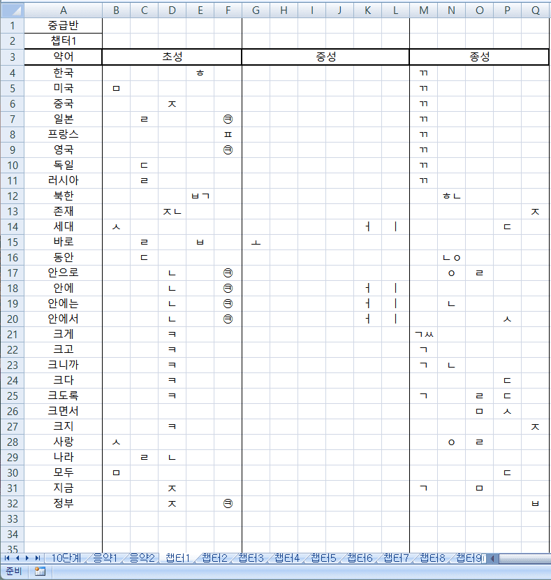 약어들은 엑셀에 칸을 키보드자리처럼 나눠주어 눈으로 보더라도 자리가 익혀일 수 있게 끔 정리하였습니다.