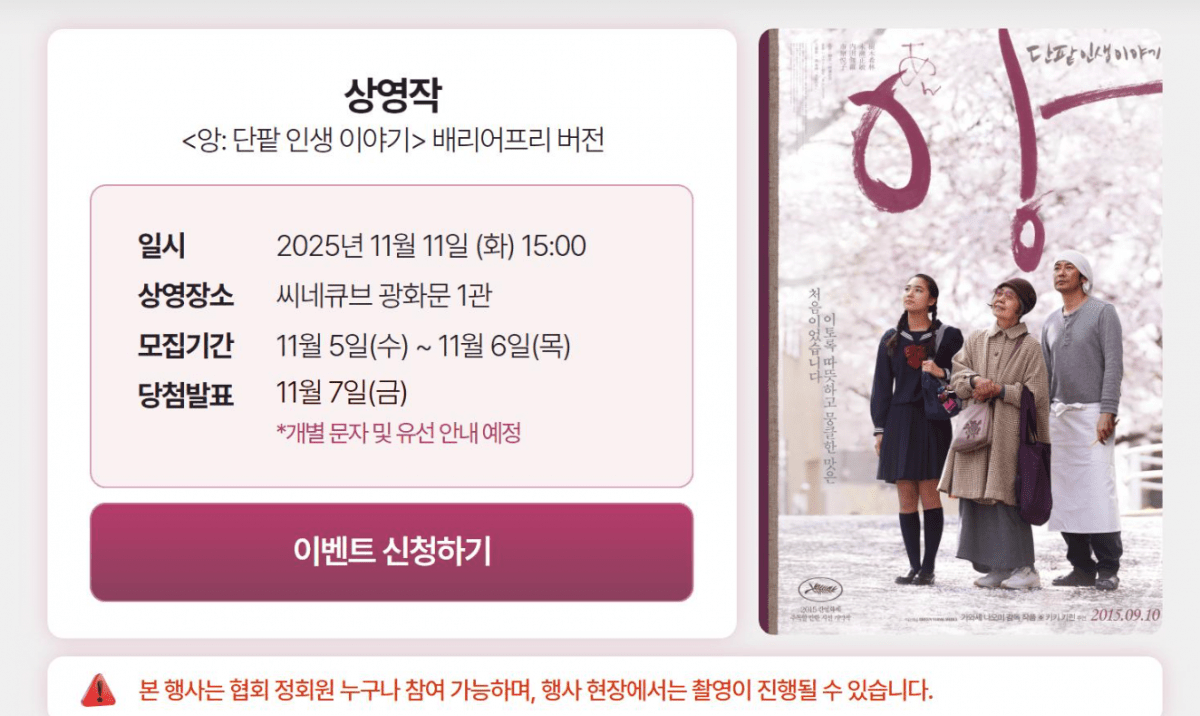 [배리어프리 영화관람 이벤트 참여자 모집] 이벤트에 신청하면 개별 문자로 당첨여부를 알려주십니다.
