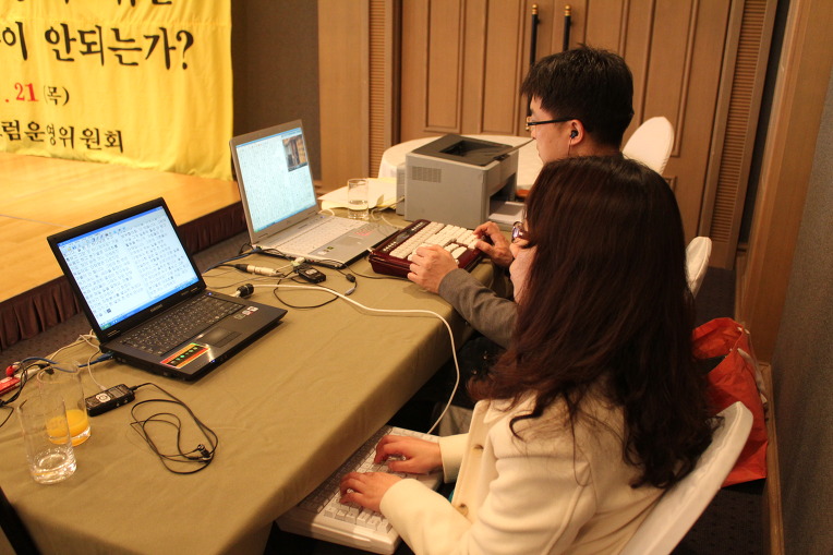 목요일이 마침 공강이기도 해서 될까 싶었지만 그래도 뒤늦게나마 신청을 하게 되었습니다 그런데 정말 운 좋게도 선생님께서 연락을 주셔서 가게 되었습니다. 새벽4시에 일어나 부랴부랴 호텔에 도착. 두근반 세근반 분위기부터가 다른 공간. 포럼을 시작하기에 앞서 맛있은 아침을 먹고 (속기사분들은 못드셨어요 ㅠㅠㅠ) 드디어 시작!! 보는내내 감탄하고 또 감탄했습니다. 어떻게 이렇게 빠를수가있지? 어떻게 이렇게 기억을 잘하시지? 저도 손가락으로 따라 쳐 보았는데 도저히 따라갈수가 없을 뿐더러 놓친부분은 다시 기억하기가 쉽지 않았는데 속기사분들은 조금 늦더라도 다 치고 가고 게다가 다 기억하면서 치셔서.. 내가 과연 할 수 있을까 하는 생각까지 들었습니다. 수정하시는 분 또한 하나도 놓치지 않고 수정해 가는데에서 또 한번 감탄을 했습니다. 수정하시는 분과 치는 분의 호흡이 환상적으로 잘 맞아야 하고 많은 연습과 많은 경험이 필요로 하는 직업인것을 다시금 깨닫게 되는 날이었습니다. 많이 보고 많이 느낄 수 있는 순간이었습니다. 이런기회를 주셔서 너무 감사하구요 앞으로 열심히 하겠습니다!!!!!!!!!! 화이팅!!!!!!!!!!!