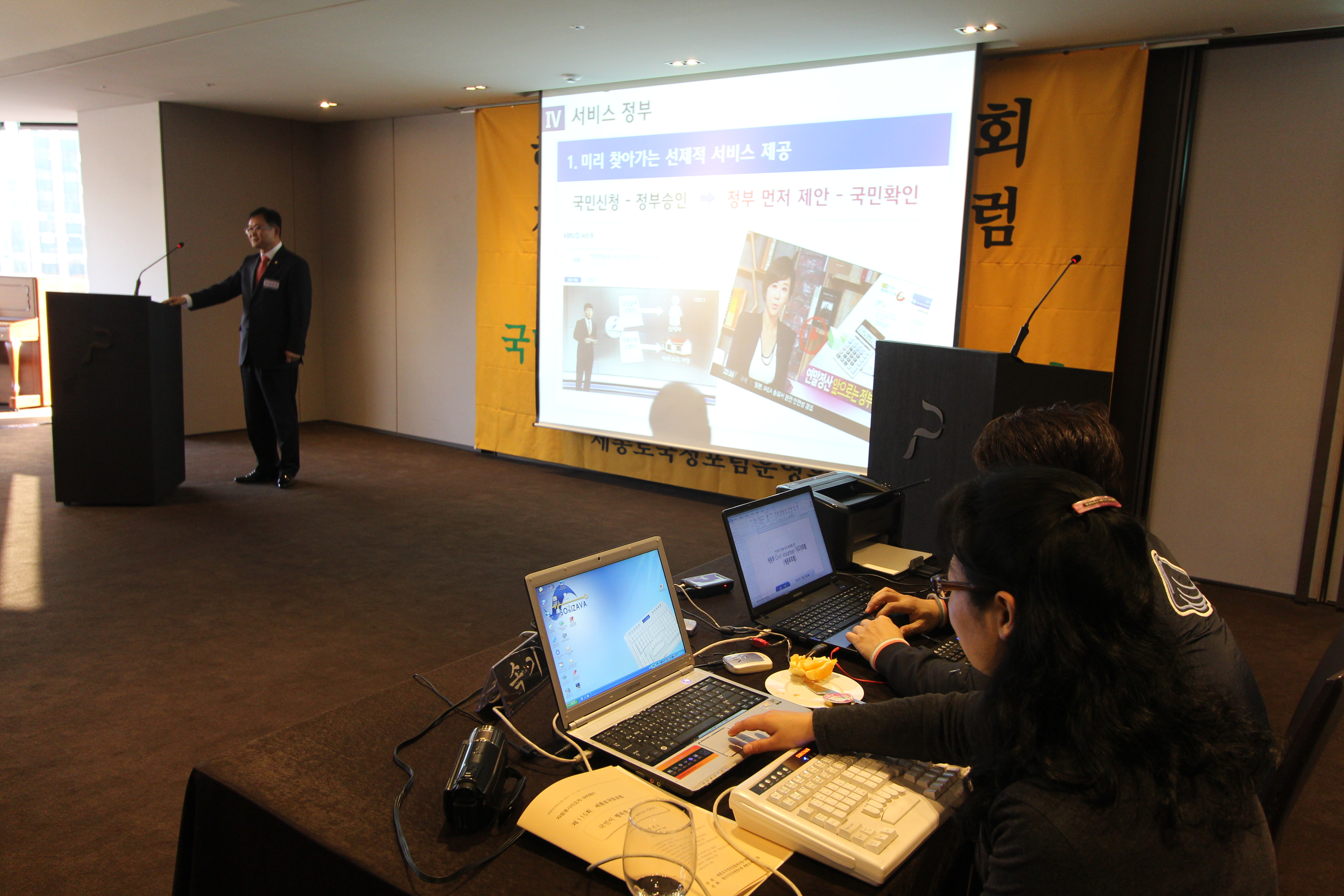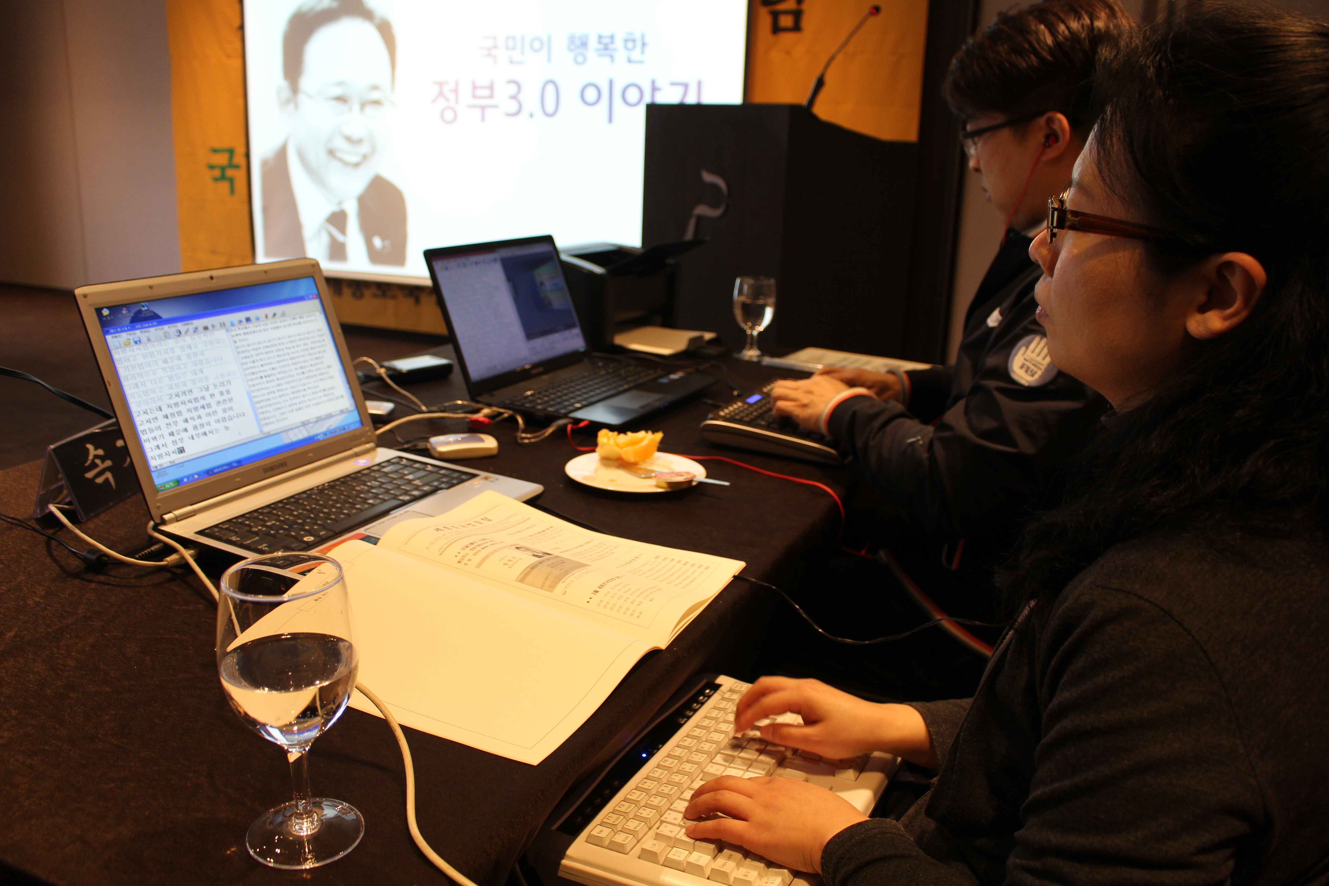 김혜란 선생님 역시 사진이랑 닮은 건 눈이 두개 코가 한개 입이 한개는 맞네 라고 생각을 하면서 속기는 미남 미녀들만 하시는 건가, 내가 안 생긴 속기사 1호가 돼야지 라는 쓸데없고 한심한 생각을 떠오르며 포럼행사를 지켜봤습니다. 각각 참여 해주신 분들에 대한 소개와 인사를 진행했는데 가장 먼저 저희 속기팀을 소개해 주시는 것을 보고 위상을 확인 할 수 있었습니다. 이윽고 차관님의 강연이 시작되고 속기사님들께서 속기하시는 모습을 볼 수 있었습니다. 네트워크 포스라는 다소 생소한 프로그램을 이용하여 한 분은 직접 타이핑을 하시고 한 분은 속기된 내용을 하나하나 검수 하며 그야말로 실시간 속기가 무엇인지 제대로 느낄 수 있었습니다.