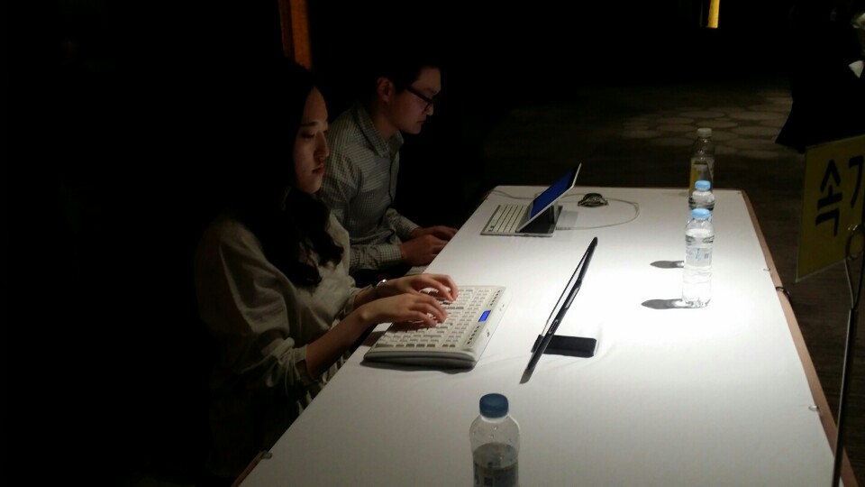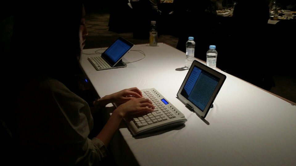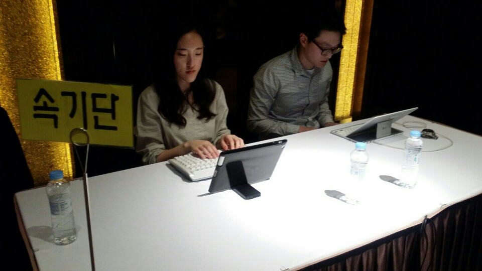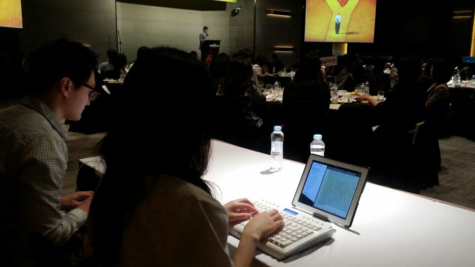 선생님께서 각자가 치는 걸 권하시긴 하셨지만 아직 실무 경험이 전혀 없는 사람들이 30분 넘게 친다는 것에 대해 다소 걱정을 하셨습니다. 하지만 선생님의 걱정과는 달리 저희는 나름 잘 했던 것 같습니다.. 아마도요..? ^^;; 포럼 준비가 되어가는 동안에 선생님께 수업, 공부, 취업, 속기봉사에 대한 궁금증 등등 온갖 질문세례를 했지만 선생님께서는 정말 하나하나 친절히 다 답변을 해주셨습니다. 정말 감사했습니다. 설명을 다 듣고 사회자께서 진행하시는 이야기를 들으며 몇 분 간 손을 푸는 도중에 속기사도 소개를 하게 되어 자리에서 일어나 앉아계신 분들을 향해 인사를 했습니다. 선생님 말씀으로는 더 큰 행사장에 가면 기자들이 속기사를 큰 카메라로 찍기도 한다고 합니다. 속기사 대우가 생각보다 좋아서 뿌듯했습니다.