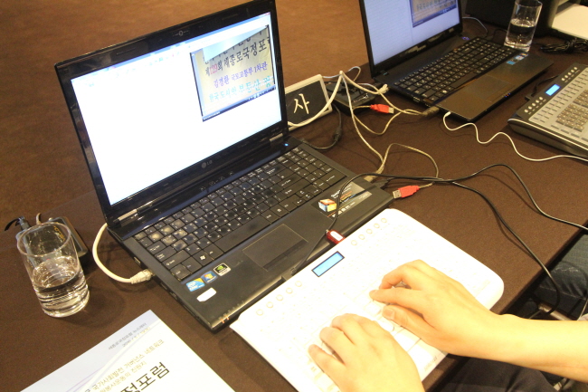 이번 포럼의 특강연사는 김경환 국토교통부 차관이셨습니다. 한국의 도시와 부동산 정책에 관한 주제로 강연을 하셨습니다. 특강을 들으면서 머릿속으로 생각하면서 혼자 쳐보기도 했는데 역시나 어려웠습니다. 무겁고 어려운 내용이었고 중간 중간에 처음 들어보는 경제용어도 많았습니다. 이번 포럼에 참여하신 속기사분을 지켜보면서, 40분 정도 되는 강연 내내 흐트러짐 없이 차분하고 정확하게 치시는 것을 보고 정말 놀라웠습니다. 평소 5분 낭독 파일에도 완벽하게 집중하지 못하는 제자신이 많이 부끄러웠습니다. 생소한 단어에도 당황하지 않고 들리는 대로 바로 치셨고, 거기에 백스페이스키도 사용하며 수정까지 하는 여유도 보여주셨습니다.