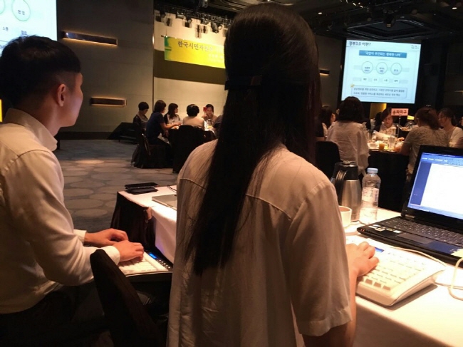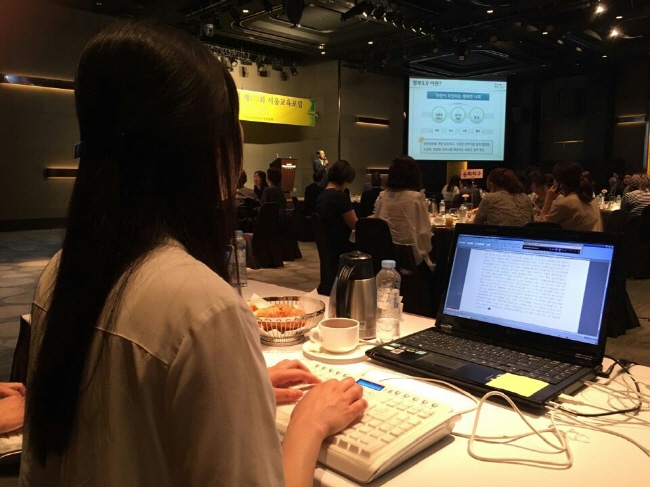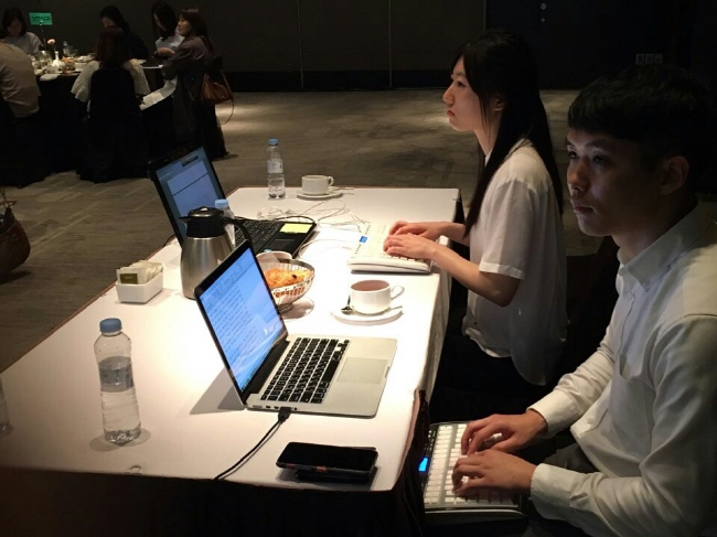 다행히 시간에 딱 맞춰 도착할 수 있었고 조금 뒤에 담당 선생님과 같이 속기를 해주실 민석 씨가 오셨습니다. 선생님께서 장비를 세팅해주신 후 사회자분 말씀을 들으며 손을 풀었습니다. 처음 해본 현장속기였지만 실시간 속기가 아니었기에 전혀 부담 없이 갔는데, 막상 포럼이 시작되니 긴장이 되더라고요. 바로 옆에 선생님이 계셔서 더 긴장됐습니다. 하지만 막상 강의가 시작되니 받아치기에 정신없어 긴장할 틈이 없었고 잠을 거의 못 잔 것치고 컨디션이 꽤 좋아 1시간 동안 집중해서 속기할 수 있었습니다.