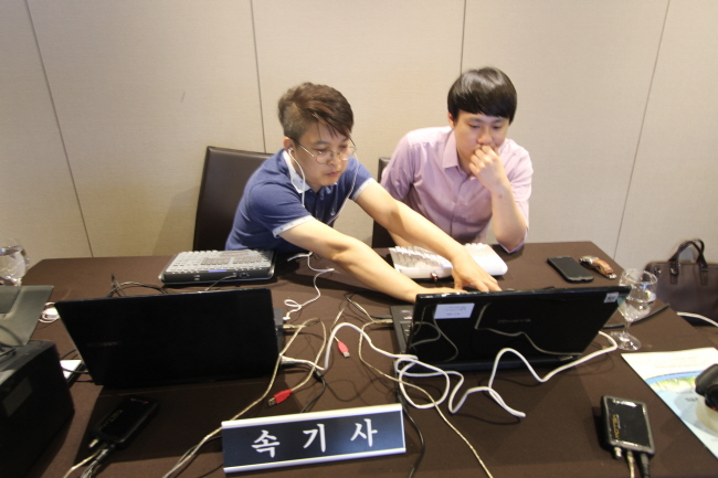 약속 장소인 호텔 근처 시청역 앞에서 윤주호 선생님, 전새별 선생님과 인사를 나누고 회의장으로 향했습니다. 속기사분들께서는 미리 오셔서 장비 세팅을 하고 계셨고, 저희가 조찬을 먹고 있는 동안에도 회의록 작성 준비에 여념이 없었습니다. 테이블에 태블릿을 설치해 주셔서 실제 현장속기 진행 과정을 생생하게 엿볼 수 있었습니다.