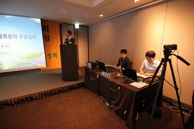 저희집에서 포럼장소까지는 약 한시간 거리여서 여유있게 일찍 일어나 전철을 타고 갔고 시청역에 내리는데 우연히 김세리선생님과 전화 주셨던 김동준선생님을 만나뵙게 돼서 포럼 장소까지 같이 이동을 하였습니다. 이른 시간에 포럼장소에는 꽤 많은 분들이 모이셨고 속기사 두분도 오셔서 준비하듯 문장을 치며 손을 풀고 계셨습니다. 포럼 자체가 처음인 저는 모든 분위기가 낯설면서도 신기했던 것 같습니다. 테이블에 속기사분들과 연결된 태블릿피씨가 설치됐고 간단하게 선생님께서 기능을 설명 해주셨습니다. 곧 오늘의 강연을 해주실 국토교통부 최정호 차관님께서 인사를 올리셨고 인사말과 동시에 속기사 한 분은 타자로 치기 시작, 다른 한 분은 오타와 탈자를 수정해주는 검수 역할을 하며 완벽에 가깝게 화면에 나타나는 것을 보니 정말 신기했습니다.