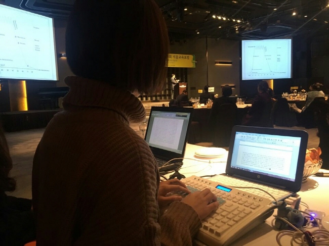 연설에 앞서 사회자님의 소개말로 천천히 손을 푸는데도 긴장되어 손 끝이 차갑고 손가락 하나하나 떨려 불안해하고 있을 때 팀장님께서 긴장하지 말라고 말씀해주셨는데 감사했습니다. ㅠ 마음을 안정시키고 다시 집중을 하며 손을 풀었고 이번 포럼의 초청연사이신 삼성서울병원 산부인과 전문의 윤병구 교수님의 연설이 시작되었습니다. 포럼에 오기 전 단어단어에 오자가 많게 되면 나중에 모두 다시 해야 하기 때문에 칠 수 있는 것만큼은 정확하게 치도록 하라고 조언해주셨던 김동준선생님의 말씀을 되새기며 '정확하게 작성하자'라고 다짐했으나 현장에서의 속기는 평소 연습하던 파일과는 확연히 달랐습니다. PPT가 있었음에도 불구하고 잘 활용하지 못했던 점, 잘 들리지 않아 당황해 다짐은 잊고 손을 놔버린 부분이 많았던 점 등 아쉬움만 남기고 종료되었습니다.