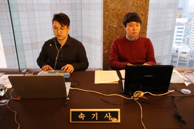 자리배치는 속기사분들의 옆 테이블에 앉아 가까이에서 속기현장을 볼 수 있었고 테블릿PC 원격을 통해 현장속기를 실시간으로 볼 수 있게 마련되었습니다. 모든 참석 인원 분들이 오신 후에 호텔 조식이 이루어졌고 이른 시간인데도 불구하고 피곤함도 잊은 채 설레이는 마음으로 세종로포럼에 참석하였습니다.