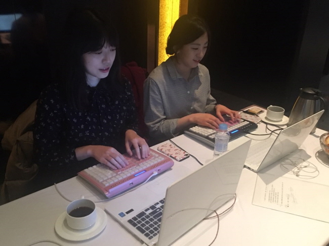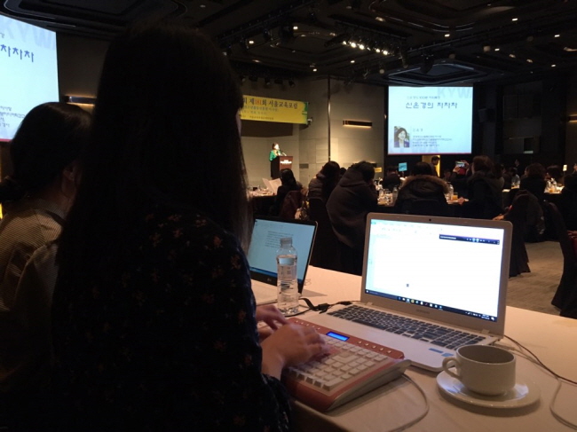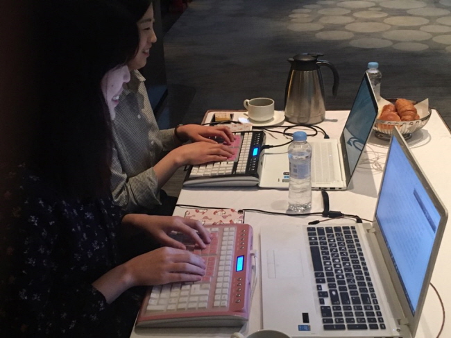 지금 하는 한글속기 공부 외에는 속기와 관련해서는 아무 것도 해본 적이 없어서 강연 시작 전에 손을 풀 때부터 긴장이 많이 됐어요. 치는 것을 보시겠다고 팀장님께서 뒤에서 지켜보시는데 긴장한 탓인지 평소보다 오탈자가 훨씬 많아지는 걸 보고 아직까지 제 공부가 많이 부족하다는 걸 느꼈습니다. 그렇게 긴장된 상태로 손을 풀었지만 사회자 분께서 속기사 소개를 해주셨는데 인사하면서 많이 뿌듯하기도 했고, 속기를 정말 잘 했구나 하는 생각도 들었습니다.