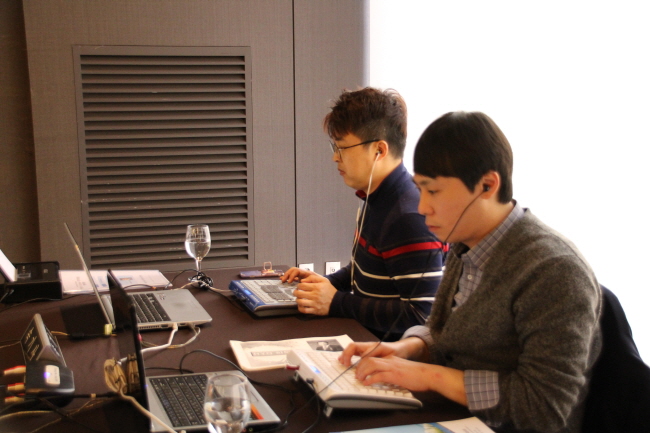 현장에 가보니 속기사 두 분께서 세팅과 준비를 모두 마치신 모습을 보고 '속기사는 누구보다 먼저 도착해서 준비된 자세가 완성되어야 하는구나'를 느낌과 동시에 반성을 하게 되었습니다. 2인1조로 환상의 호흡을 보여주신 속기사 두 분은 정말 대단하고 존경 스러웠습니다. 영어,한문,행동표현 그리고 띄어쓰기까지 완벽한 실시간 속기를 보고 있자니 속기사로서 저의 열정에 더 큰 불을 지펴주셨습니다. 무엇보다 노련하신 속기사님의 자세를 관찰했는데 손이 사.뿐.사.뿐 그 자체였습니다. 제 경우 급하게 치려는 선생님들의 충고에 도대체 어떻게 여유있게 치라는 것인지 이해를 못했는데 직접 목도하니 '저런 느낌이구나' 하는 감이 잡혔습니다.