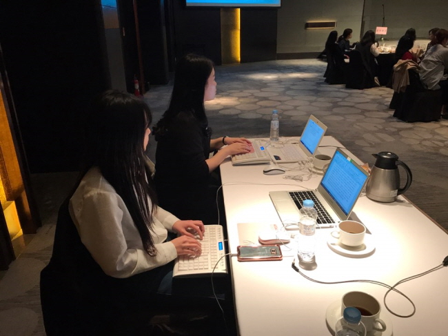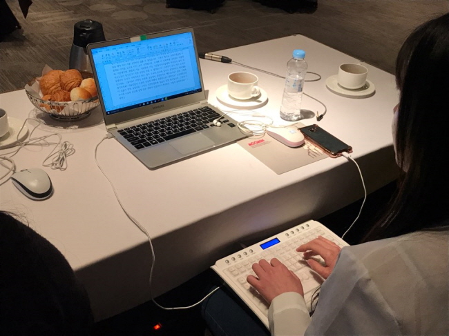 담당 인솔자이신 안상현 팀장님께 도착했다고 연락을 드린 뒤 저는 바로 속기석에 앉아 노트북과 키보드를 꺼내 준비를 마쳤습니다. 혼자 손을 풀고 있을 때 함께 속기를 하기로 한 현영 씨께서 도착했고 저희는 이런저런 많은 이야기를 나눴습니다. 속기라는 공통된 주제로 이야기를 나누다 보니 시간 가는 줄 몰랐습니다. 그렇게 현영씨와 이야기하던 도중 안상현 팀장님께서 오셨고 긴장도 풀어주시며 도움이 되는 말씀들을 많이 해주셨습니다.