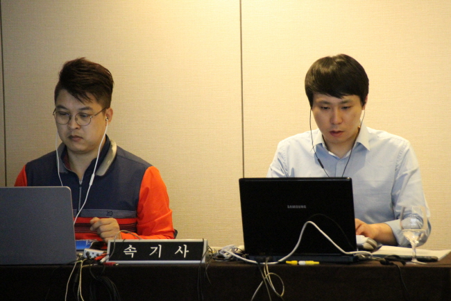 한국철도공사 홍순만 사장님의 ‘스피드 이노베이션’ 이라는 주제로 시작한 연사에서 저의 관심사는 실시간 속기 과정이었습니다. 2인 1조로 구성되어 한 분은 실시간으로 속기하고 다른 한 분은 타임머신으로 다시 들으며 오탈자를 수정하는 방식인데 연사가 끝나자마자 속기록이 완성된 것을 보고 감탄을 금치 못했습니다.