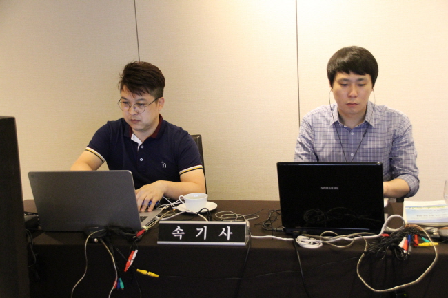 박은성 선생님은 이날 연사의 발표 속도가 이전의 연사들보다 빨랐고, 영어 단어나 문장을 많이 구사하셔서 한글 속기 1급 시험보다 더 어렵다고 하셨는데 이런 상황에서도 속기사 선생님은 연사의 말을 다 받아치고 계셨습니다. 그러나 속기사 선생님도 사람이기에 1차 작업에서 빠지거나 오자가 발생하는 것을 볼 수 있었습니다. 그렇기 때문에 다른 속기사 선생님의 업무가 2차 작업으로서 오탈자 수정 작업이 아닐까 생각합니다. 오자나 탈자, 비표준어 단어 등을 수정해 나가셨는데 이 작업도 쉬운 일이 아니라는 박은성 선생님의 이야기를 들을 수 있었습니다. 청자 입장에서는 짧을 수도 있는, 하지만 3분 듣고 치기도 힘들어하는 속기 꿈나무인 저에게 약 40여 분간 진행된 연사의 발표를 빠짐없이 담아내는 속기사 선생님들의 모습이 존경스럽고, 한편으로 속기 업무에 대한 보람도 느낄 수 있는 부분인 것 같다는 생각을 하게 되었습니다.