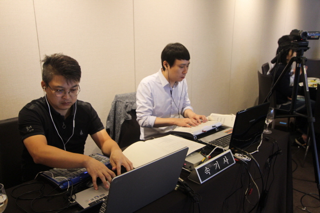 세종로포럼은 새벽부터 시작한다고 해서 걱정이 많았었거든요.(제가 아침형인간은 아니어서) 그랬는데.. 아니나다를까..... 정말죄송하게도... 5분...... 지각.. 포럼을 함께 했던 박전진선생님과 노희균선생님 그리고 함께 참석하신 세원씨에게 죄송.. 하다는 말씀드리며 후기를 작성해보도록 하겠습니다. 매번 포럼 신청할 때 마다 잘되지 않아 포기할까 하던찰나 이번 9월 포럼에 운좋게 선정되어 너무 기쁜마음으로 포럼에 참 석했는데요. 도착하자마자 제눈에는 잘 세팅되어있는 테이블보다 먼저 와계신 속기사분들이 눈에 들어 왔습니다. 자리에서 세팅중이셨는데 그 모습에 반하여 매번 속기공부가 잘 안된다고 이런 저런 생각을 하던 저의 모습을 반성하게 되었습니다.