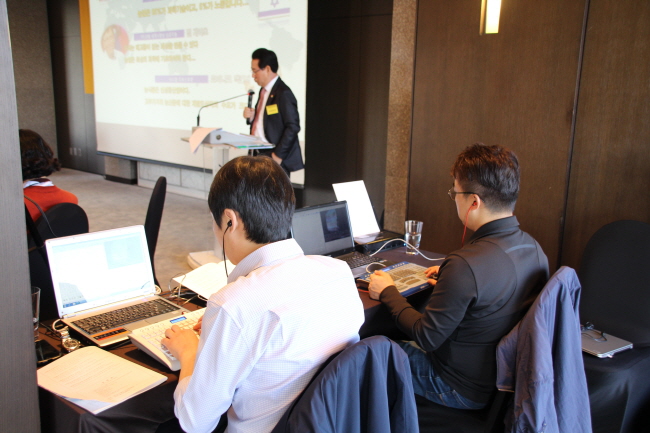 포럼은 상당히 이른 시간에 개최되어서 평소보다 훨씬 이른 시간에 일어나야 했습니다만 다행히도 포럼 개최 장소가 집에서 가까웠고 평소 많이 지나치던 곳이기에 다행히 늦지 않게 도착할 수 있었습니다. 도착해서는 김진아선생님께서 저를 맞아주셨고 곧이어 같이 체험에 참가하게 된 이연지씨와 박정웅선생님께서 차례로 도착하시고 포럼에 입장했습니다. 간단한 식순 이후에 본격적으로 농림축산식품부 김영록장관의 포럼이 진행되었습니다. 장관의 연설이 시작되자 배석한 두 분의 속기사께서 속기를 시작하셨습니다. 한 분은 연사의 말을 바로 속기하기 위해 배석하고 다른 한 분은 실시간으로 나오는 속기를 바로 수정하고 검수하는 작업을 위해 배석해 계셨습니다. 생각했던 것과는 달리 실제 현장에서의 연설은 그렇게 빠르지만은 않았습니다. 그러나 모든 연사가 언어학을 공부하거나 낭독 전문가는 아니기 때문에 계속 정확한 발음으로 말 할 수는 없습니다. 따라서 중간 중간에 부정확한 발음으로 말하거나 연사의 말이 제대로 들리지 않는 경우가 발생하는데 그럼에도 불구하고 정확하게 속기하시고 검수를 통해 상당히 많은 부분을 바로잡으셨습니다.
