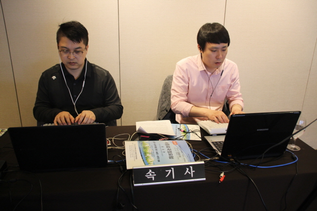 포럼이 시작되고 속기사 분들은 2인1조로 완벽한 팀플레이를 보여주셨습니다. 한분은 속기하시고 한분은 수정하시는데 실시간으로 되는게 정말 존경스럽습니다. 발표자분이 말씀이 빠르시고 단어가 정확히 안들리는게 종종 있었는데 센스있게 작업을 해나가시는 과정이 정말 대단했습니다.