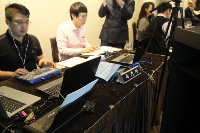 연설이 시작되고 나서부터는 네트워크포스를 집중하여 보았습니다. 저는 이런 실무현장을 태어나서 처음 와보았기 때문에 처음 본 장비였습니다. 네트워크포스에 연사님의 연설이 하나하나 정확하게 오자 없이 신속하게 써지는 걸 보고 감탄을 했고, 또 저도 부족한 실력이지만 한번 허공에 키보드가 있는 것 마냥 운지를 하고 따라도 해보았습니다. 메인으로 속기를 하시는 분의 속기도 중요하지만 그 옆에서 2인 1조로 실시간으로 검수를 하시는 분의 역할도 매우 중요하다고 생각이 들었습니다. 완벽하게 연사님의 말을 속기하고 또 다듬는 과정을 눈으로 직접 보니 아 이런 게 실무구나 하는 생각이 더 확 와 닿았습니다. 놀라운 것은 연설이 끝나고 속기록이 약 5분 만에 완성돼 인쇄되어 나온다는 점이었습니다. 속기록을 연사님께 드리자 연사님께서도 아니 이렇게 빨리 나오냐고 놀라시면서 감탄을 하셨습니다.