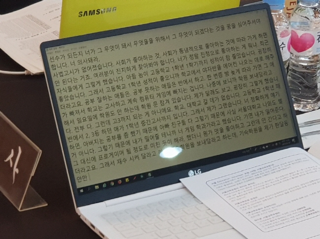 포럼 시작하면서 상장 수여식을 먼저 했어요. 사회자분이 연설자분을 소개해주셨습니다. 연설자분은 윤문원 작가님이 셨는데요. 중고등학교 도덕 교과서, 문학 교과서에도 작가님 글이 실려있다고 하셨어요. 다행히 작가님은 말이 그렇게 빠르신 분은 아니셨어요. 하지만 작가님이시다 보니 외국 유명 작가들이나 철학가, 모르는 유명인들을 말씀하시거나 어려운 말을 하실 때가 있으셨어요. 그럴 때는 속기하기 좀 어려웠습니다. 다른 속기 봉사 갔을 때는 다른 한 분과 15분이나 20분 또는 30분씩 돌아가면서 쳤는데 이번 포럼은 선생님께서 처음부터 끝까지 다 치라고 하셨어요. 한 30분 넘어가니 조금씩 집중이 흐트러졌었습니다. 역시 속기사에게는 집중력이 많이 필요하다는 것을 다시 한번 느꼈어요. 작가님이 중간쯤에 파워포인트를 띄우시느라 잠시 쉬어주셔서 정말 감사드렸습니다.