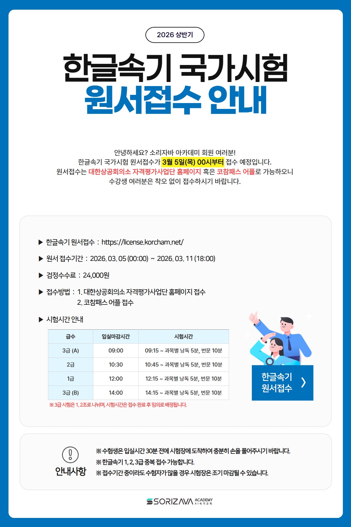 ◆ 2026년도 상반기 한글속기 국가시험 원서접수 안내 ◆