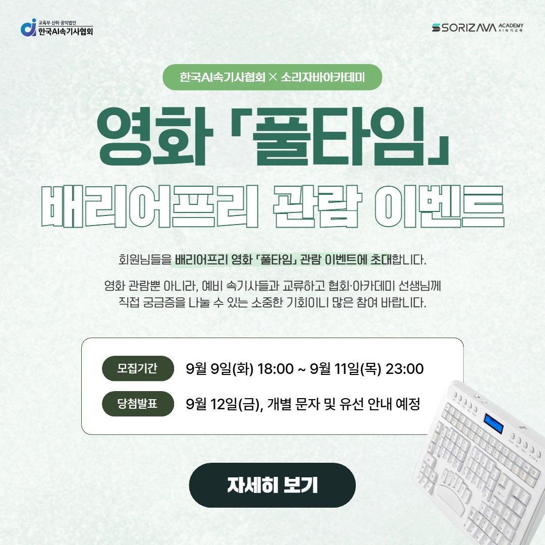 한국AI속기사협회와 소리자바 아카데미가 공동 주최하는 ‘2025 배리어프리 영화 관람 이벤트’가 오는 9월 16일(화) 열린다. 이번 행사는 예비 속기사들이 배리어프리 자막 제작 과정을 직접 체험하고, 속기사 직무의 사회적 가치를 이해할 수 있도록 기획됐다. 참가 신청은 9월 11일(목)까지 가능하다.