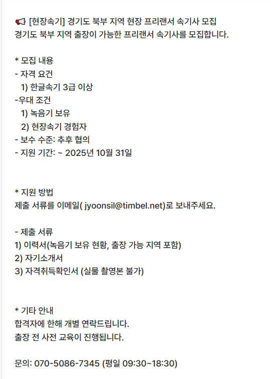 (주)팀벨 경기도 북부 지역 현장 프리랜서 속기사 모집 공고