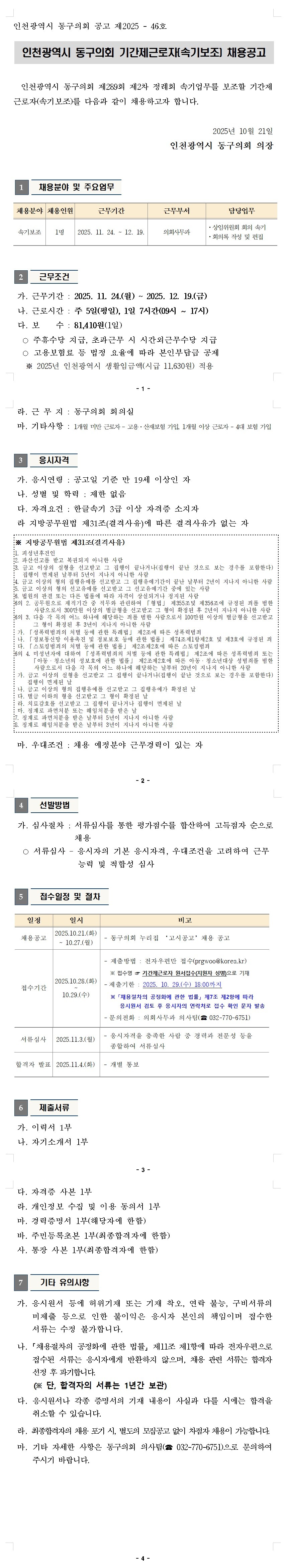 인천광역시 동구의회 기간제근로자(속기보조) 채용 공고