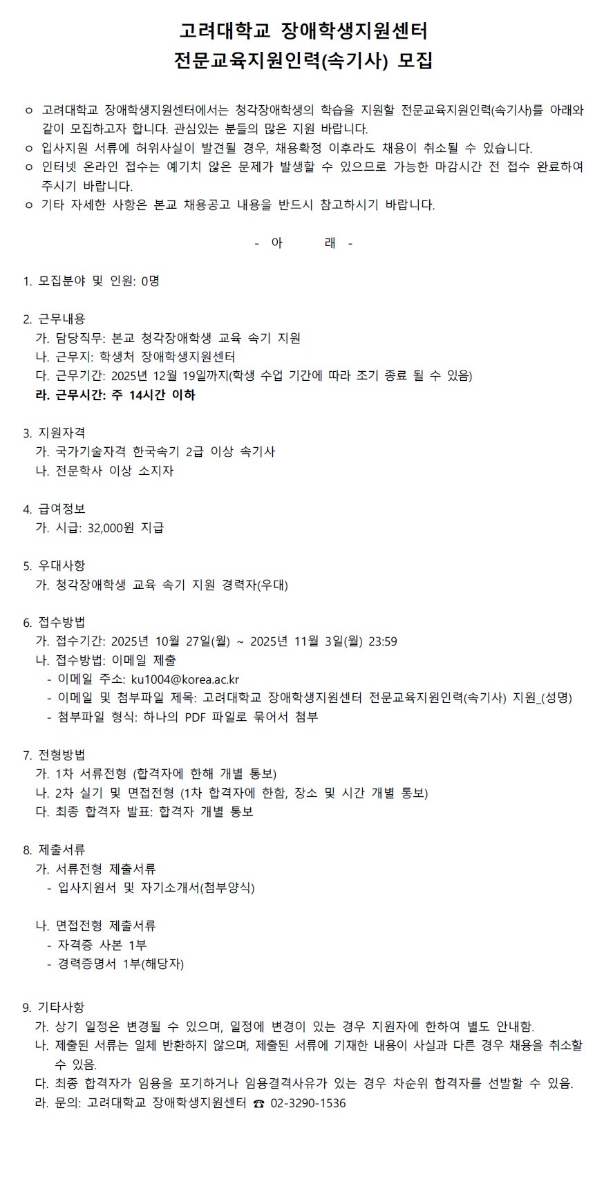 고려대학교 장애학생지원센터 전문지원인력(속기사) 채용 공고