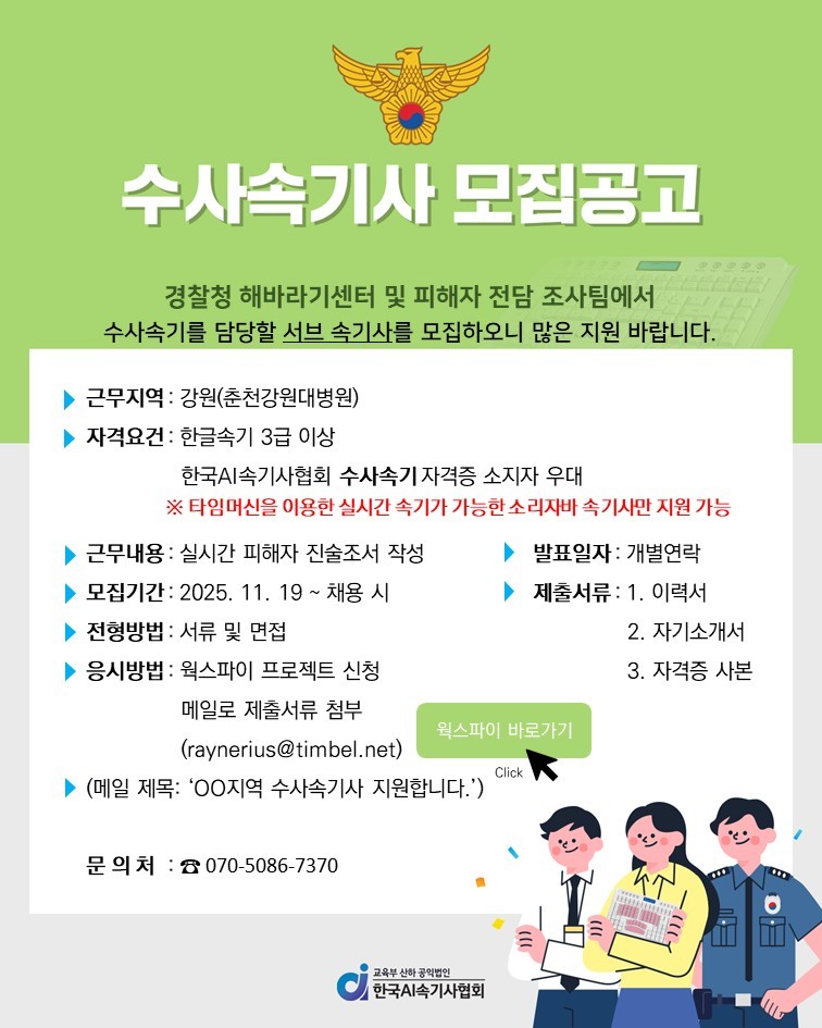 경찰청 해바라기센터 서브 수사속기사 모집(춘천강원대병원)