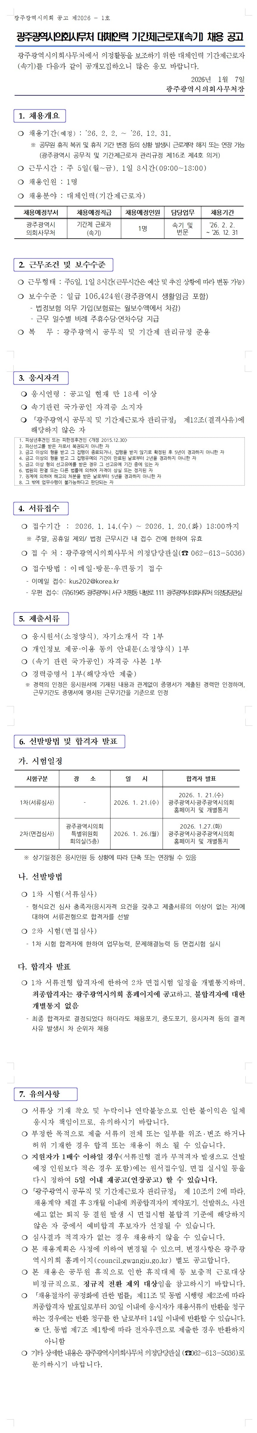 광주광역시의회 대체인력 기간제근로자(속기사) 채용 공고