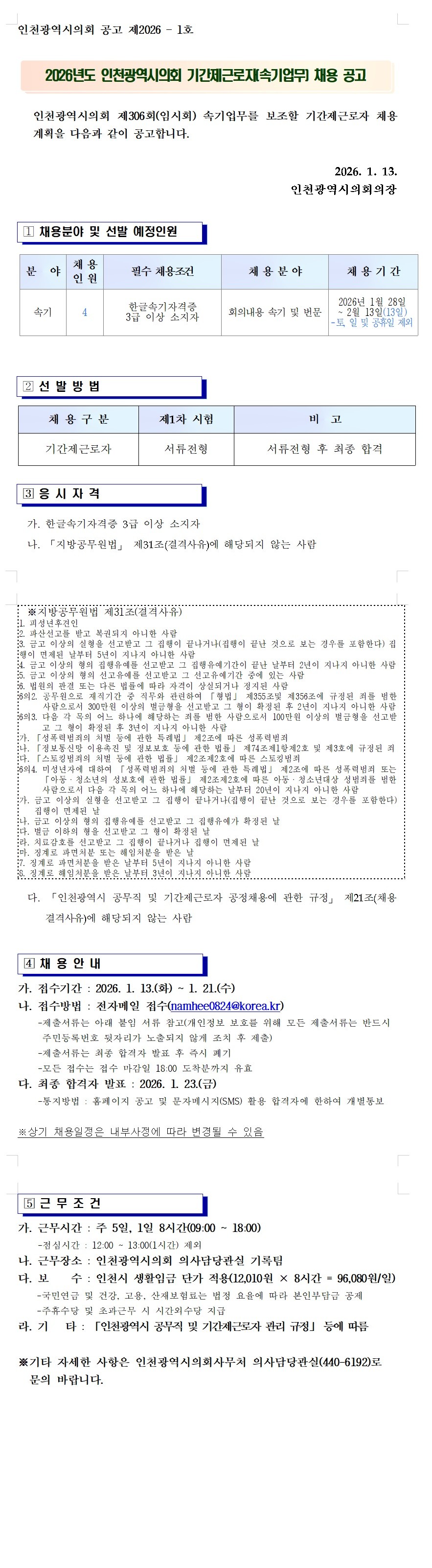 인천광역시의회 기간제근로자(속기사) 채용 공고