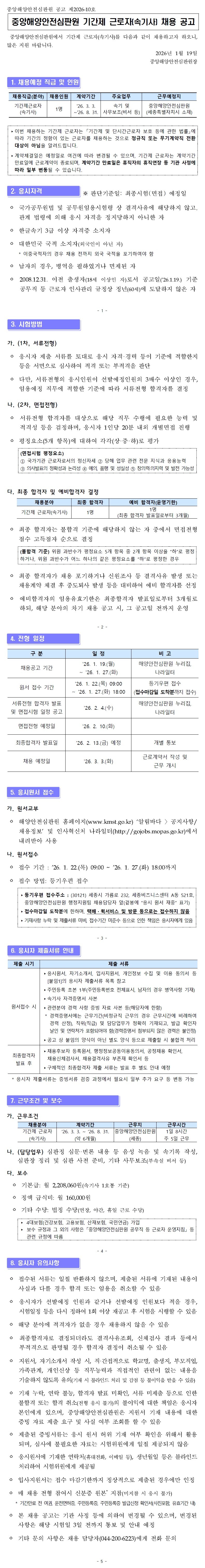 중앙해양안전심판원 기간제근로자(속기사) 채용공고