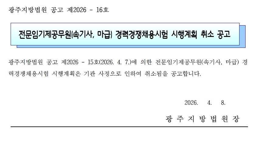 광주지방법원 전문임기제공무원(속기사) 경력경쟁채용시험 시행계획 공고 취소